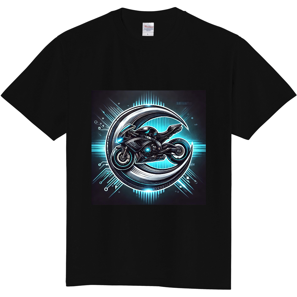 近未来的なデザインが光るロゴ、スピード感溢れるバイクと光り輝く月が融合。メタルの質感とネオンブルーのアクセントが、力強さと先進性を象徴しています。このロゴは、革新とスピードを追求するブランドにぴったりです。